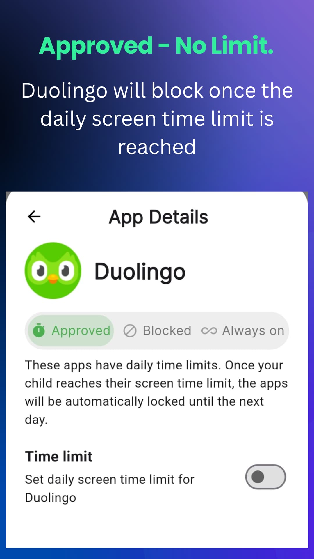 Example: You set daily screen time limit for 1 hr/ every day. You might approve YouTube but limit it to 30 minutes a day, while allowing Duolingo with no limit. so duolingo will get blocked once daily screen time limit of 1 hr is reached.